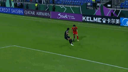 看到主裁判出示红牌,阮庭北跪倒在地。这一幕也让越南主帅看傻了眼,随后向主裁判做出两名球员各有50%触球机会的动作。